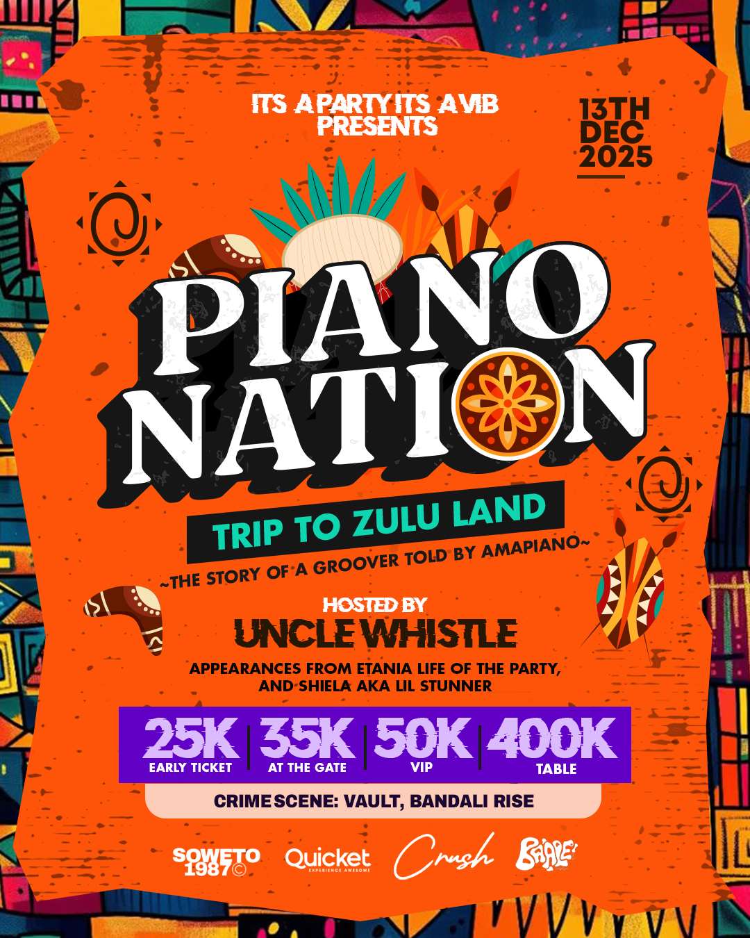 ?? PIANO NATION: TRIP TO ZULU LAND IS COMING! ?? Get ready for an unforgettable journey into the heart of Amapiano! "It's A Party It's A Vyb" presents PIANO NATION: TRIP TO ZULU LAND – a night where the rhythms tell "The Story of a Groover told by Amapiano." Expect pulsating beats, infectious melodies, and an atmosphere that will have you dancing until dawn. Don't miss the ultimate Amapiano experience